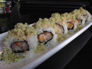 The Crunchy Scallop Roll. Scallop, flying fish roe, and aonori tempura bits.