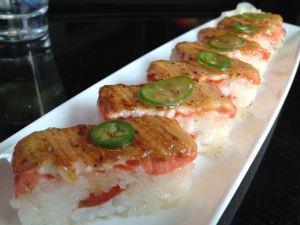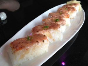 The Aburi Ebi Oshi Sushi. Here, it’s more sweet and sour than spicy, with a combination of ume and lime zest doing the honors.