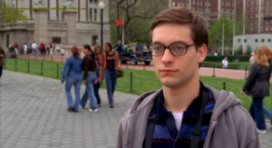 Movie begin wit nerdy Peter Parker who, on visit to genetic lab, get bitten by very spiteful experimental spider. He return home feeling like monster after dat time me mistakingly ate Bert’s “special happy” brownies. And den angry Bert break ceramic lamp over monster’s head. VERY woozy. Next morning, Peter wake up wit muscles and special abilities like power of jumping, strength, agility, wall climbing, web shooting and, most important of all, power of costume design and sewing. Oh, and like all real life spiders, he possess spidey sense dat warn him of danger.