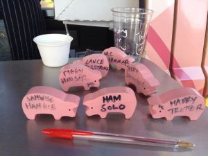 I placed an order for a bacon-wrap at Pig on the Street. You just grab one of the pig-themed markers and they’ll call your name once the order is ready. I went with Jerry Swinefeld.