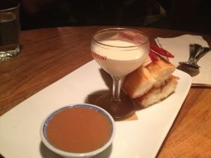 Chinese Donut (Youtiao) with condensed milk caramel, ginger, and palm sugar soy milk. Probably the most popular dish of the night. Surprised?