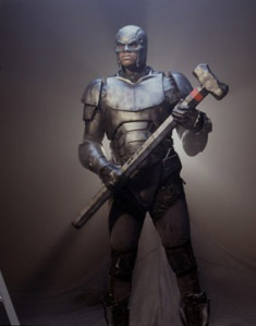 Shaq report dis to his commanding officer – who not all dat interested, mirroring general attittod of audience watching dis sad piece of film making. So, Shaq say “F him” and put together his own cliche team: wheelchair-bound Sparky, kid, and old man (who, at one point in movie, aktually use de line: “I’m getting too old for dis!”). A-Teamesque building montage ensue. Dey forge supersuit of steel (dat look suspishushly like hard plastic). Armed wit giant hammer (Not for hitting bad guys. It just a magnet of course!) Shaq John Henry Irons is Ironma Steel!