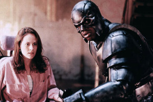 In Steel, Shaq play part of genius weapon designer John Henry Irons. Dis bear repeating. SHAQ play part of a GENIUS. He design weapons for army. Anyway, movie begin wit one of his weapons test gone awry. Ceiling collapse, kill gabby senator and injure Shaq’s friend, Sparky, de girl wit de dog’s name. All de fault of Evil Judd Nelson who try to act tough and get in Shaq’s face – tho dis very hard to do when guy you’re trying to stare down be two feet taller den you.