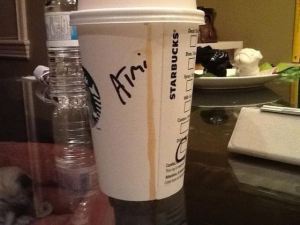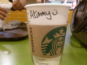 For some reason, Akemi’s name baffles most English speakers who seem incapable of pronouncing it correctly, often offering a variety of erroneous renditions: Acme, Kimmy, Akenny, Ankimo, etc. Nowhere is this more frustrating than at Starbucks where the person at the counter not only mispronounces her name, but writes it down incorrectly as well. But I’m pleased to report the Starbucks has gotten better. Witness the evolution of the Akemi cappuccino…
