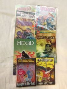 Pictured above, my Comic Con goodies including: a couple of dvd’s from the archives of Spike & Mike Festival of animation (compliments of Mike), a copy of the Futureshocks anthology edited by Lou Anders with cover art by John Picacio (compliments of Lou Anders), a copy of Hexed vol. 1 and the missing issues in my Avengers and Thunderbolts collection (compliments of my wallet).