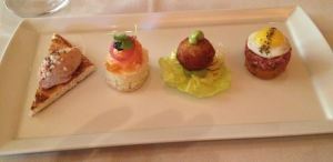 The Hors D’Oeuvres. From left to right: Foie Gras PB&J, Cured Salmon, Crab BLT, and the Steak Tartare. Three out of four were terrific. The BLT was a bit of a letdown.