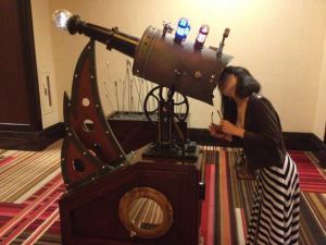 Akemi checks out the steampunk telescope – to get an unreal view of the ceiling.