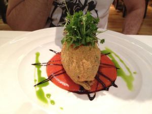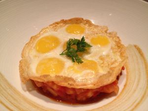 The golden fried quail eggs atop a bed of Spanish ratatouille. Akemi’s favorite.