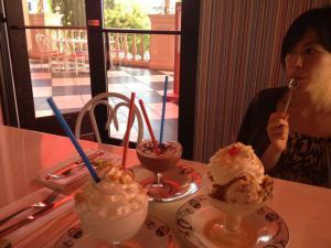 We ended up trekking all the way over to the Wynn Hotel in search of a fantastic dessert place I swear I remember visiting once – only to come up empty. We trekked all the way back and, by the time we were within visual range of our hotel, we were hot and exhausted. So I suggested a little pick-me-up in the form of a sundae at Serendipity.