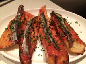 Pan de cristal con tomate: Toasted rustic bread brushed with fresh tomatoes, topped with anchovy.
