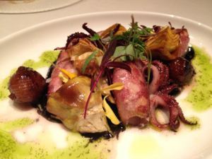 Grilled squid with roasted artichokes in a squid ink sauce.