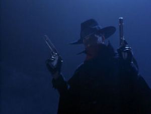 He track him down. Tim Curry try to shoot at shadow on de wall, but de real Shadow not hurt. Which be kind of strange since, in earlier scene, Shadow gets pinned to wall wit crossbow bolts. Why crossbow bolts effekt him but bullets don’t?