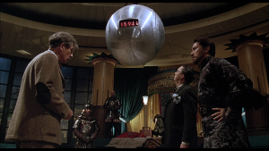 Mindreading love interest, Margo, have father/scientist (and, monster suspekt, part-time wizard) who work for War Department. Khan Jr. use his crazy mind control powers to kidnap father and make him build…pre-atomic bomb atomic bomb! But Lamont figure dis out by analyzing coin Khan Jr. use to pay him for glass of bourbon.
