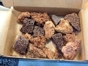 A collection of aerated chocolate rocks in 45% milk and 72% dark chocolate.