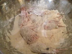 After washing the prawn heads and patting them dry, toss them in flour. You can add some salt, pepper, maybe garlic powder or paprika as well but I’d avoid any herbs or minced garlic that could overcook and turn bitter in the extended frying process. I was considering using egg or even some soda water, but Akemi advised against it.