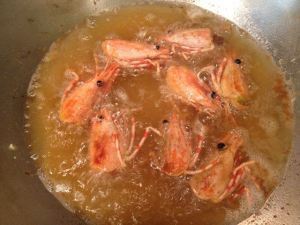 Heat some canola oil in a wok (or deep-fryer of your choice) and heat the oil to somewhere between hot and really hot (380 degrees, let’s say?). Pop your prawn in and cook ’til crispy, about five minutes.