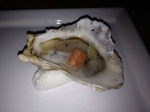 Local and sustainable Sawmill Bay oysters with citrus and vodka mignonette. Akemi is a huge fan of oysters and loved this little bite. They’re tiny so, next time, we might consider starting with a dozen.