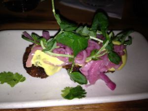 Chickpea fritters with curry mayo, pickled red onions and pea shoots. The combination of the ingredients really made this dish. The pickled red onions were a genius element.