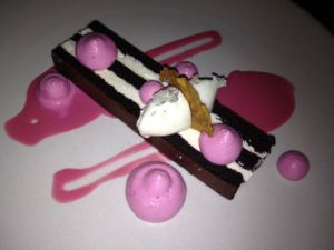The flourless chocolate cake with rhubarb cream. The only misstep of the night. I was looking forward to the rich denseness of a true flourless cake but was disappointed by the alternating layers of white chocolate ganache that reminded me of a buttercream birthday cake.