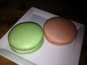 And the macarons: lime on the left and dulce de leche on the right. The former was a little chewy and could have used some tarting up with more of a lime kick but the latter was perfect in flavor and texture.