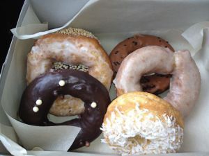 A half-dozen dougnuts from Cartems Donuterie. Sorry, vegans. Your sans gluten offering touted as “cruelty-free” was, ironically, the cruelest version you could possibly serve a doughnut-lover. Baked, topped with toasted quinoa, it tasted like slightly sweet bread. The Triple Threat Chocolate was good, but trumped by the Mexican Mole. The winners, however, were the Classic and Citrus Dust, both of which proved mouth-meltingly delicious.