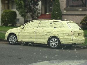 Can you imagine stepping out your front door to THIS? From a distance, it looked like a really bad paint job – but, upon closer scrutiny, that bad paint job actually turned out to be thousands of tiny, carefully-applied post-it notes. How long do you figure it would take to pull off something like this? Half an hour? An hour? Try two and a half hours. How do I know? Well, as it turns out, my writing partner’s wife was responsible. I showed him the pic the other day and he nodded: “Yeah, that was Michelle.” Yep. Two and a half hours and her hands were numb by the time she was done, but it was a practical joke well worth the effort. No word on how long it took the victim to remove the post-it notes or the state of his hands.