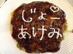 No doubt inspired by our latest foray into okonomiyaki-making (see last Saturday’s blog installment), Akemi makes her own version for dinner complete with mayo message topping.