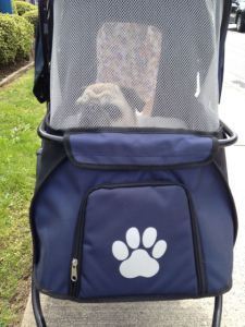 Which brings me to this little item that had been sitting in the garage, gathering dust. We tend to walk the dogs separately because at thirteen and suffering from hip dysplasia, our eldest pug Jelly has a hard time keeping up with our other two dogs, nine year old pug Bubba and four year old French bulldog Lulu. But she seemed perfectly content to go for a ride the other day, letting the youngsters do the walking while she kicked back and enjoyed the scenery.