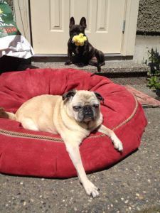 And, since we’re on the topic of elderly pugs – as many of you know, I’m looking into taking in a couple of lovable seniors. I was contacted by the Seattle Pug Rescue who requested pics of the house and a letter of reference from my vet. All good, but I thought that – as some of you have suggested – I should also consider supplying links to this blog. I’m presently in the process of compiling a list of suitable dog-related posts for forwarding. Off the top of your heads, any specific posts stand out?