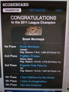 The entire R.I.P. Stargate fantasy football league season came down to last night's football game. With my Snow Monkeys up big, my opponent needed 50 points from his players to overtake me. How's he do? Would you believe 51 points?! Fortunately, I had a player in yesterday's game as well – the Green Bay kicker – who put up a modest 5 points for me. Modest but much appreciated because it put me ahead 3.5 points with only one player active for tonight's final game. Fortunately, that player is mine and barring a complete catastrophe that sees him fumbling the ball twice AND not gaining a single yard, that championship is mine. But I'll hold off on the celebration another day (you guys are all invited. BYOB!). Don't want to jinx it.
