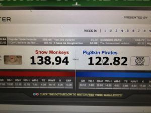 Whew! I'm beat. Gonna sit back and watch the Sunday night game. If Aaron Rodgers and Ryan Grant fail to put up 50+ fantasy points for my opponent, then my Snow Monkeys win their first fantasy football league championship! If they do put up those 50+ points, then I'll have to rely on Roddy White to come through for me tomorrow night. But let's hope it doesn't come to that?