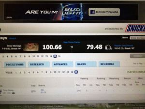 Don't want to get ahead of myself, but it looks like my Snow Monkeys may be poised for an upset in my R.I.P. Stargate fantasy football league semi-final. Romo is lighting up the Bucs D and, after much consideration, I decided to play Dez Bryant after all – and he rewarded me by scoring a TD. And we're only at halftime.