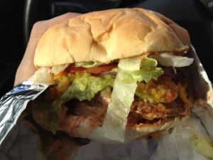 Crispy Chick 'n Burger: Gardein, chipotle mayo, guacamole, apricot/jalepeno relish, tomato, lettuce, onion.