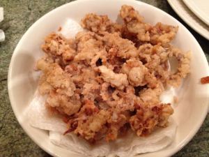 Recipe: Rinse your tentacles and tubes, then pat dry. Heat some sea salt (or salt of your choice) in a wok along with some peppercorns and spicier pepper seeds (ie. tepin or pequin) until they brown, then transfer them to a mortar where you will grind them to a fine powder with a pestle. Place three tablespoons of flour in a plastic baggie along with the ground powder and some Old Bay seasoning. Pour some vegetable oil into your wok and switch the heat to high. Transfer your tubes and tentacles into the baggie and give them a shake, making sure they're good and coated. Once the oil is hot enough, lower the individual coated squid pieces into the wok and allow them to fry up to a golden brown (usually about a minute a piece). Serve with sweet chili dipping sauce (available in most grocery stores).