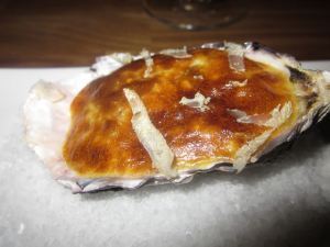 Plate #1: Vermouth-poached oyster with white truffle Hollondaise and white truffle shavings.