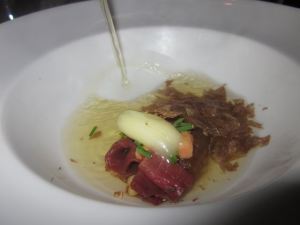 Plate #2: Raw goose and goose fat with daikon, chives, and shaved truffle in goose brodo.