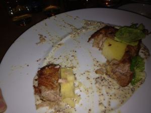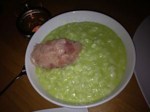Seriously. It's the type of culinary concept and plating that would get someone kicked off Top Chef in the first round. As for the flavors: bland with an underlying tartness. Two bites in and I was done. The Chef came out to inquire about our meal, apologized, and offered us a complimentary entree on our next visit. Very nice of him and I return the favor by not mentioning the name of the restaurant – but suffice it to say I don't think I'll be taking him up on the offer.