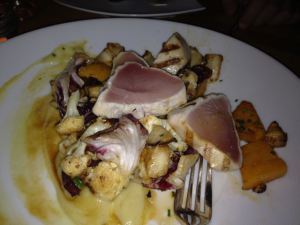 Seared rare albacore tuna with a salad of winter vegetables and garlic confit.