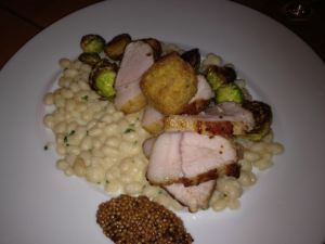 Sloping Hill pork with brussel sprouts, white navy beans, and dijon.