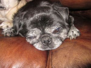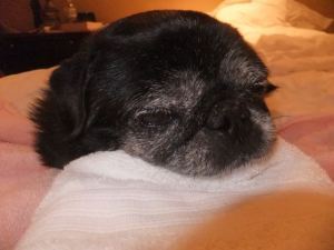Maximus turns in. Since his diagnosis, he prefers to sleep with a towel tucked under his chin.