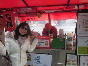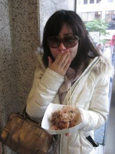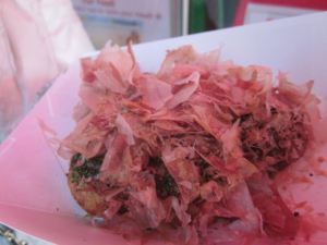 Cha-daah! Serving battered octopus balls with a choice of toppings ranging from nori (seaweed) to maple syrup.