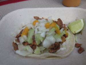 Serving up tasty taco variations. I went with the rotisserie pork and onions with habanero sauce. Our favorite food item of the day!