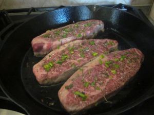 I brought them up to room temperature a half an hour before cooking, then seasoned them with salt, pepper, thyme, rosemary, and chives before searing them over medium-high heat in a cast-iron pan -