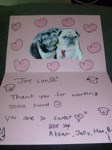 I've been averaging between 65-70 emails a day since joining the production. Yesterday, I doubled that with over 165 emails and counting. Since posting my last blog entry, I've received a slew of supportive missives from friends in the industry, former co-workers, my mom (!), and even a (Trevor-style) card from Akemi hastily assembled last night while I was showering -