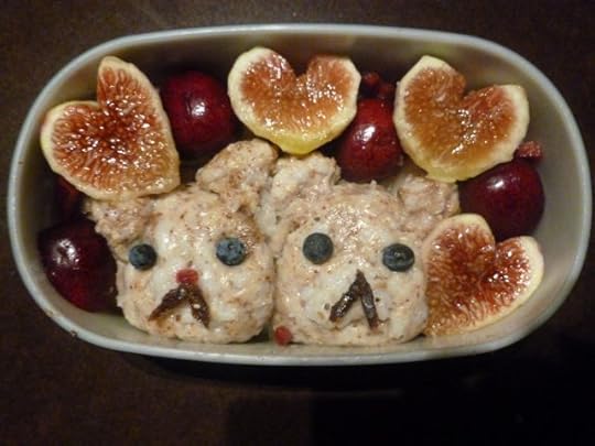His very own bento box complete with heart-shaped figs, cherries, blueberries, banana, oatmeal kuma-chan, hiyoko, and (unedible) panda!