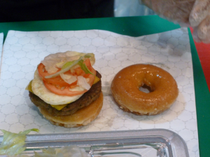 The Luthor! A cheeseburger topped with lettuce, tomato, bacon, and a fried egg sandwiched between two Krispy Kreme doughnuts. And only 1500 calories.