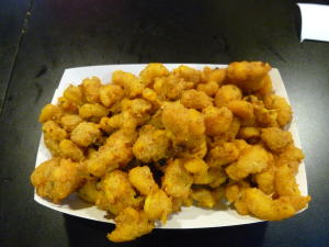 We intended to head back only discover it was pouring rain outside. So headed back inside and killed time by walking around – and eating some more. I sampled some deep-fried coca cola (I believe they deep-fried the syrup and the result resembled a brown funnel cake). I also picked up some wings at this place that offered choices ranging from mild to suicide. When I ordered the suicide, the girls at the counter chuckled. They told me it was because the suicide was insanely hot but I suspect it was actually because they knew I'd be disappointed by their weak kick.