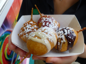 From bottom left clockwise: deep fried Jo Louis, deep fried Mars Bar, and deep fried Twinkie.