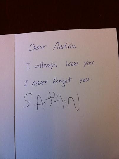 Hey, check it out. My sister, Andria, recently received a card from Satan. He professes his love for her and then, rather ominously, vows to never forget her. Well, truth be told, it was a card from one of the kids at her daycare – a kid who, apparently, has trouble spelling his real name. Not sure what it is but sis assures me it aint Satan. Even if it was, I wouldn't have been all that surprised what with the ridiculous names wackos (aka celebrities) are bestowing on their newborns these days. Of course, hilarious monikers aren't limited to Hollywood offspring. My friend Janice once worked with a guy named Seamen Hung. So far, in my books, he holds the title of "Worst Name". Do you have a friend, relative, or unfortunate worker who trumps Seamen? I want to know.