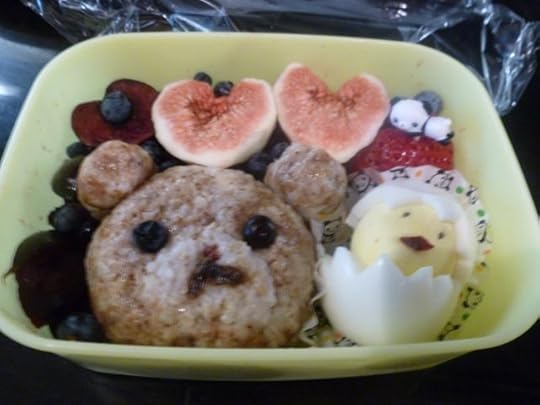 His very own bento box complete with heart-shaped figs, cherries, blueberries, banana, oatmeal kuma-chan, hiyoko, and (unedible) panda!